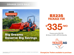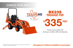 Kubota Financing deals going on NOW! Get this BX23S Tractor package for $0 down 4.99%APR for 84 MONTHS! Stop on in or give us a call for more information on these packages!